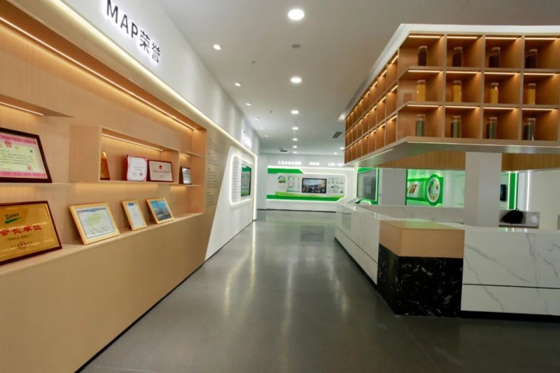 奧揚(yáng)設(shè)計(jì)本展廳以白色為主色調(diào),配以麥田黃、MAP綠色輔色調(diào),搭配清新干凈的灰色調(diào)。