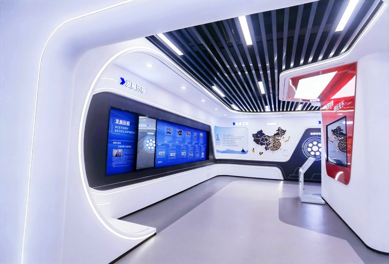 展廳中多處運(yùn)用電子互動(dòng)大屏放映企業(yè)專題片,并且將展廳墻體直角部分改為弧形,與曲面屏呼應(yīng)的同時(shí)增強(qiáng)了空間的整體流動(dòng)性。展廳運(yùn)用統(tǒng)一基礎(chǔ)標(biāo)準(zhǔn)色調(diào),使得整個(gè)展廳風(fēng)格更加統(tǒng)一。在頂部運(yùn)用線性燈與筒燈進(jìn)行融合照明,提升視覺美感。